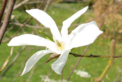 Die Weidenblättrige Magnolie (Magnolia salicifolia) ist ein laubabwerfender Baum mit bis zu 10 Meter Höhe. Ihre Heimat ist Japan. Der Wuchs ist kegelförmig, die Blätter sind - wie der Name schon sagt - lanzettlich und ca. 12 cm lang. Die weißen Blüten duften, die sechs Tepalen (Blütenblätter) sind eher schmal und erscheinen im April. Die Weidenblättrige Magnolie benötigt einen sauren Boden.